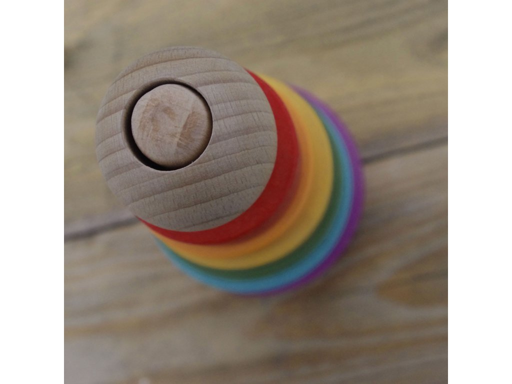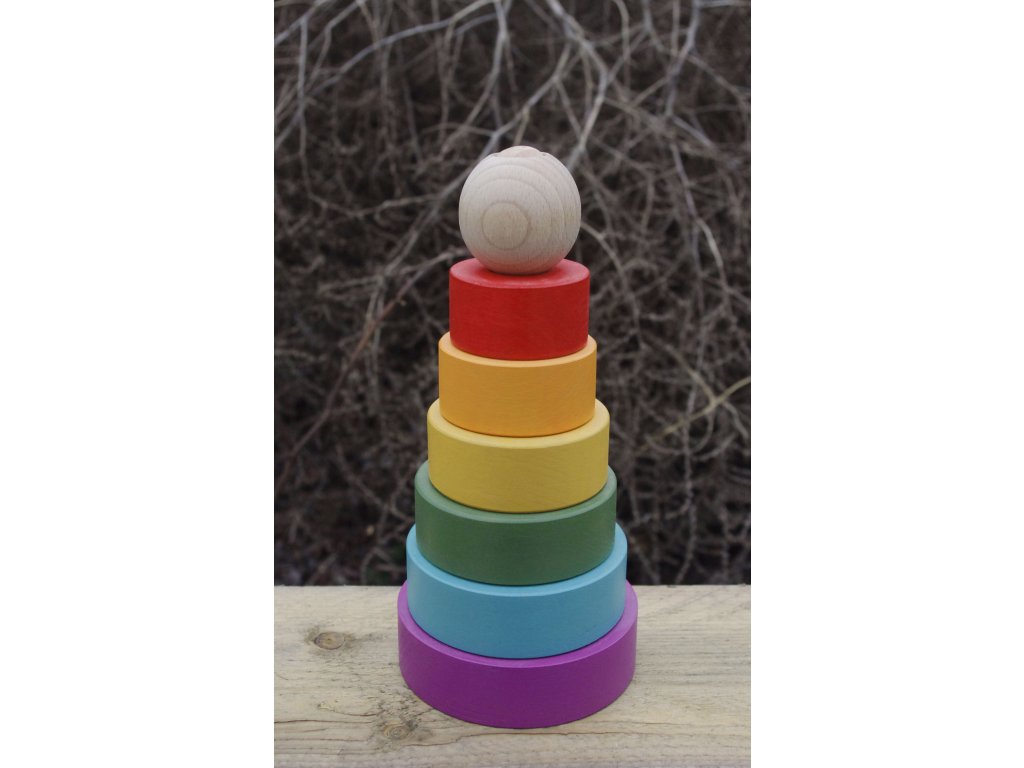 Szivárvány torony – rakosgató játékEz a szivárvány torony egyszerű formáival és harmonikus színeivel a nyugodt, elmélyült játékot támogatja. A különböző méretű elemek egymásra helyezése fejleszti a kéz–szem koordinációt, a finommotorikát és a térbeli gondolkodást.